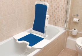 The Bellavita is the lightest bath lift on the market weighing only 20.5 lbs. This Bath Lifter by Drive Medical was designed with the assistance of healthcare professionals. It is excellent for standard or deeper model bath tubs. At a minimum sitting position of 2.3″, it is the lowest bath lift on the market. The comfortable padded backrest can recline up to 50 degrees at the seat's lowest position – Another market best. The water-tight hand control floats in water, making it easy to access the control buttons while bathing. Two-piece construction makes this lift easy to assemble and disassemble for transport, and tool-free setup ensures simple installation and operation. The back folds for space-saving storage. Washable hygienic covers are available in white, blue or grey, and hygienic cutaway and slim-line profile make handling a cinch. This product comes standard with four quick-release suction cups providing an anti-slip base for added safety and security. In addition to all the special features, the lift includes several additional options for your convenience. An option for two additional suction cups offers the potential for even further security and headrest for additional comfort. The product can withstand a weight capacity of 300 pounds. It includes a three-year guarantee on the battery/handset.